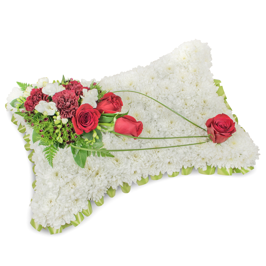 Express your heartfelt condolences with our elegant bouquet, featuring a stunning mix of white chrysanthemums, red roses, white freesias, dark red carnations, delicate dianthus, and graceful bear grass.